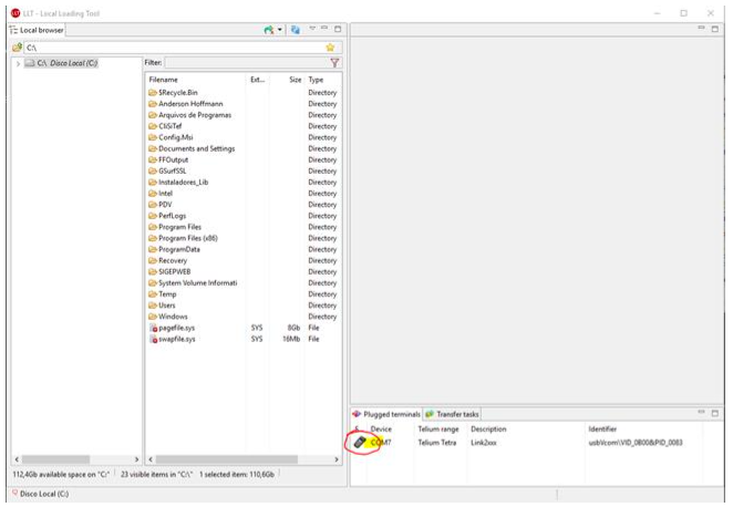 Colocar o terminal em modo LLT, para isto, ligar o terminal e durante a tela Welcome, ficar pressionando a tecla ‘-‘ ou ‘.’ até aparecer o logo de uma pasta. Executar o programa LLT.EXE. No canto inferior clicar duas vezes no icone do terminal.