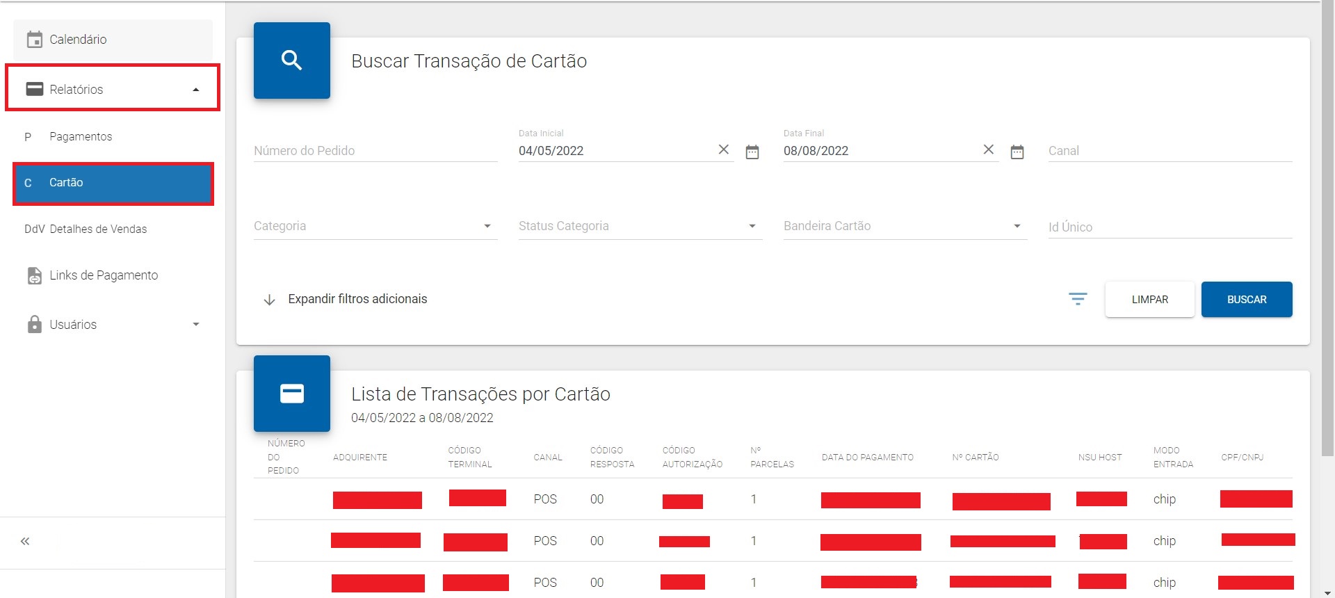 No menu "Relatórios", na opção "Cartão", irá contar todas as transações realizadas por meio de cartão.