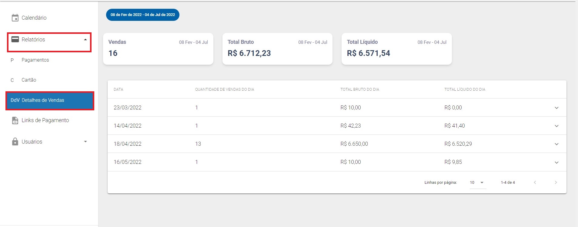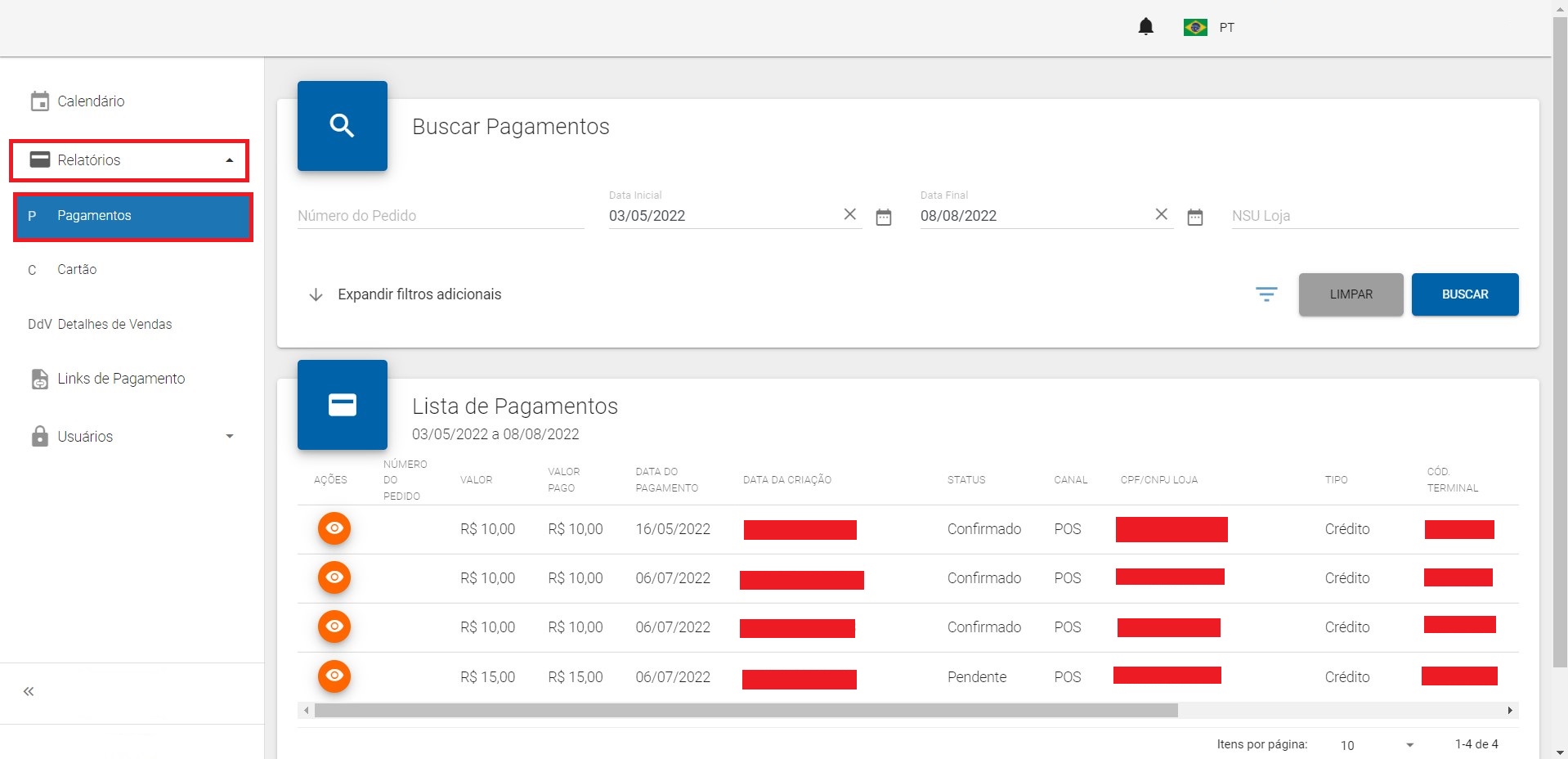 No menu "Relatórios", opção "Pagamentos", contém todas as transações realizadas, seja por meio de boleto ou cartão. Nele você também pode definir a busca por uma data ou período.