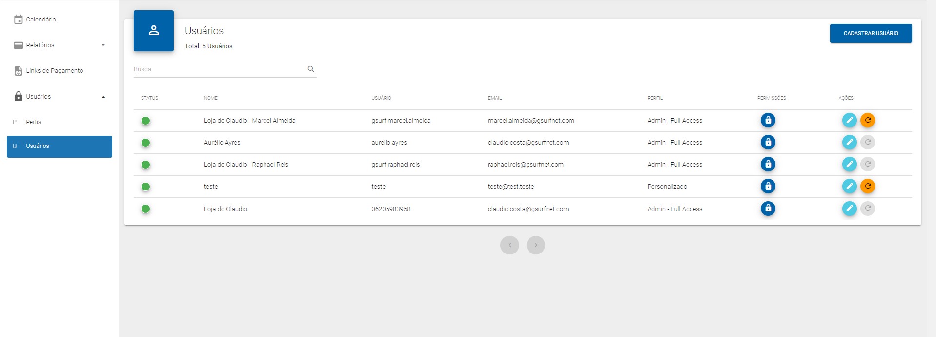 Caso deseje adicionar um novo usuário, vamos clicar em "CADASTRAR USUÁRIO", no canto superior direito.