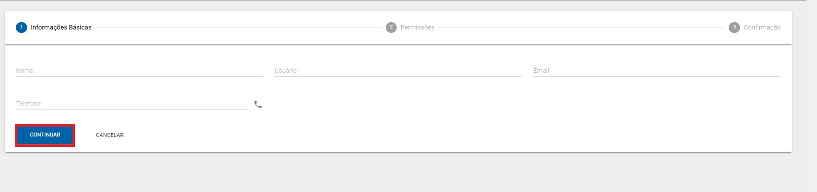 Nesta tela, vamos digitar algumas informações, como: nome, usuário de login, email e telefone. Após inserir as informações, clique em "continuar".